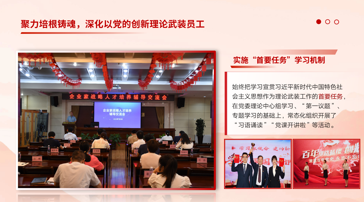 近年來,集團黨委堅持把思想政治工作作為一項經(jīng)常性、基礎性工作來抓,融入現(xiàn)代企業(yè)治理、經(jīng)營管理、企業(yè)文化建設、員工隊伍建設,形成了全員、全程、全覆蓋的國有企業(yè)大思政模式,有效發(fā)揮了“生命線”的獨特作用,推動了企業(yè)高質(zhì)量發(fā)展。實施“首要任務”學習機制,實施核心價值培育機制,實施企業(yè)文化熔鑄機制,推動愛國主義、集體主義、社會主義教育深深融入員工血脈,厚培員工以企為家、愛企如家的歸屬感和凝聚力。