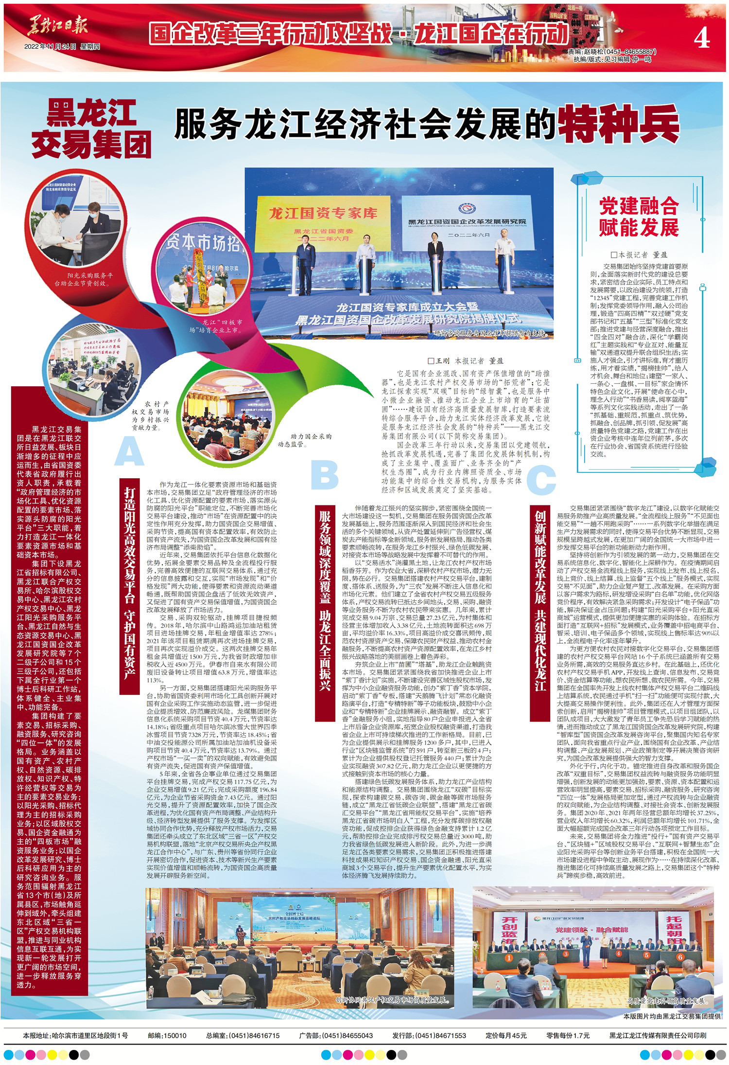 它是國(guó)有企業(yè)混改、國(guó)有資產(chǎn)保值增值的“助推器”,也是龍江農(nóng)村產(chǎn)權(quán)交易市場(chǎng)的“拓荒者”;它是龍江探索實(shí)現(xiàn)“雙碳”目標(biāo)的“綠智囊”,也是服務(wù)中小微企業(yè)融資、推動(dòng)龍江企業(yè)上市培育的“壯苗圃”……建設(shè)國(guó)有經(jīng)濟(jì)高質(zhì)量發(fā)展智庫(kù),打造要素流轉(zhuǎn)綜合服務(wù)平臺(tái),助力龍江實(shí)體經(jīng)濟(jì)改革發(fā)展,它就是服務(wù)龍江經(jīng)濟(jì)社會(huì)發(fā)展的“特種兵”——黑龍江交易集團(tuán)有限公司(以下簡(jiǎn)稱交易集團(tuán))。
