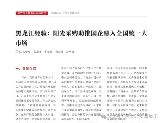 新聞中心 > 子公司動態(tài)近日,黑龍江陽光采購服務(wù)平臺在《中國招標》期刊發(fā)表了題為《黑龍江經(jīng)驗:陽光采購助推國企融入全國統(tǒng)一大市場》的文章。在全國統(tǒng)一大市場建設(shè)不斷取得新進展、實現(xiàn)新突破的背景下,陽光采購服務(wù)平臺也在激發(fā)龍江國企活力,特別是在國有企業(yè)采購領(lǐng)域,交出了自己的答卷。